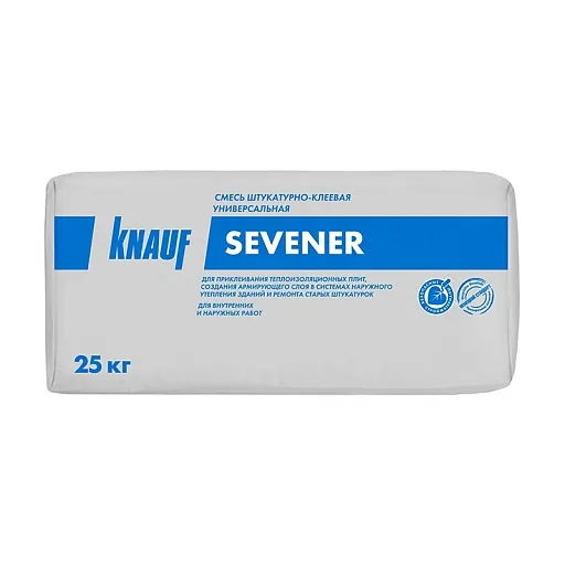 Клей для теплоизоляции Knauf Sevener – штукатурно-клеевая смесь для приклеивания теплоизоляционных плит, армирования при внешнем утеплении зданий, восстановления поврежденного штукатурного слоя. Рекомендована для наружных и внутренних работ; для ручного и машинного нанесения. В составе – цементная основа с мелкофракционным песком, полимерные добавки, армирующие волокна.